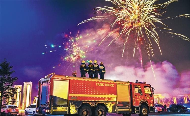 ▼除夕夜,黑龙江双鸭山市的消防队员在岗位坚守。