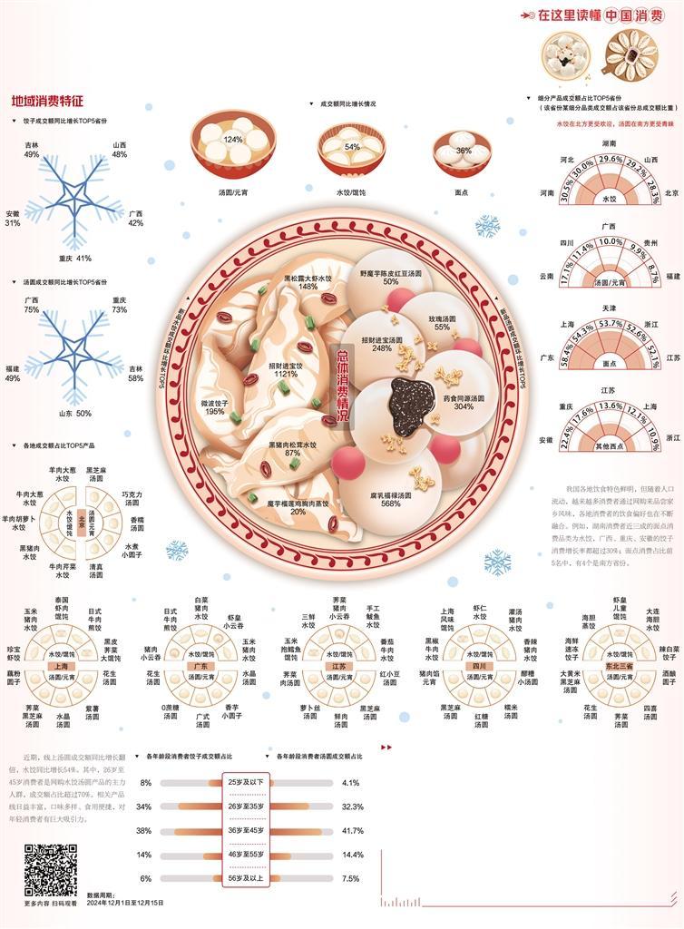 “冬至大如年,人间小团圆”。冬至前,饺子和汤圆等产品的线上销售呈现显著增长趋势。市场上新产品新口味层出不穷,丰富了居民的餐桌,也给冷冷冬日增添了许多温暖。