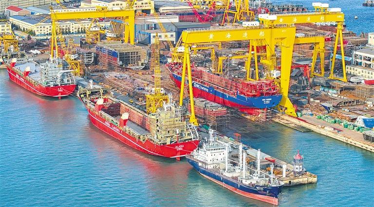 12月21日,在山东省荣成市石岛管理区修造船产业基地船坞内,工人抓紧建造大型船舶。岁末,各大造船企业开足马力赶制订单。目前,多家造船企业订单已排至2028年。李信君摄(新华社发)