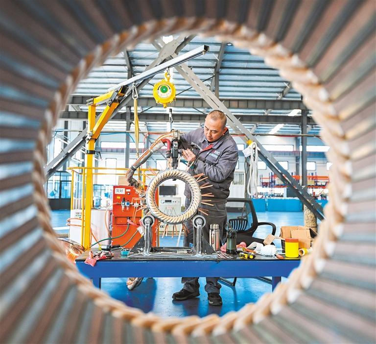 ◀12月3日,山西省永济市凯瑞电气有限公司生产车间,工人在加工电机产品。常 奇摄(中经视觉)