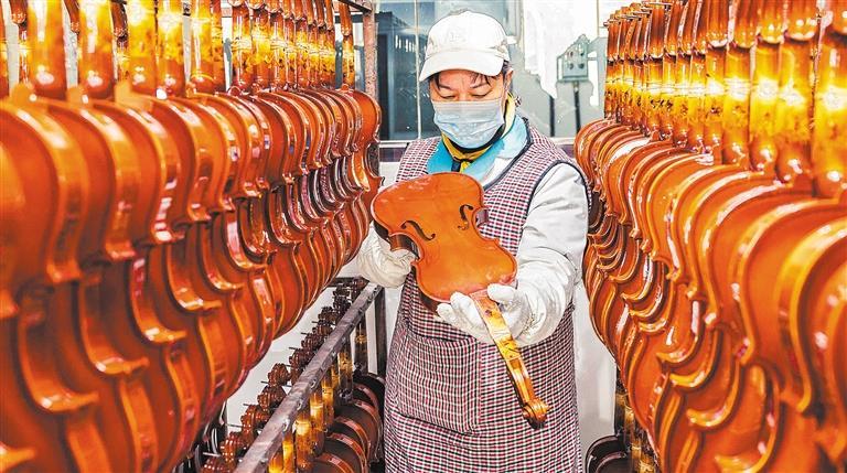 ▼12月19日,江苏省泰兴市黄桥镇凤灵集团,员工在检验小提琴品质。