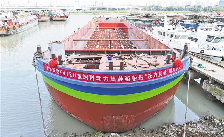 12月18日,全国首艘内河64标箱氢燃料电池动力集装箱船舶“东方氢港”号在浙江省嘉兴市秀洲区王江泾镇成功下水。该船舶采用嘉兴港区本土企业制造的2套240KW氢燃料电池组作为唯一电源,续航能力达380公里。相比传统燃油动力船,每年可减少二氧化碳排放约700吨。作为浙江氢能未来产业先导区,嘉兴港区拥有丰富的氢能资源,可满足氢能船舶大量、快速充氢需求。赵颖硕摄