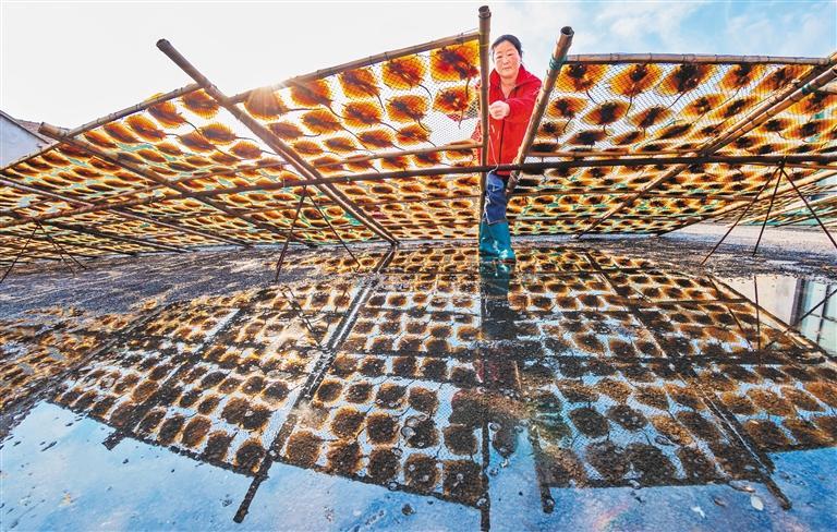 ▶12月17日,江苏省连云港市赣榆区柘汪镇马站村,渔民将鱼虾晾晒成风味干品,通过互联网销往各地。司 伟摄(中经视觉)