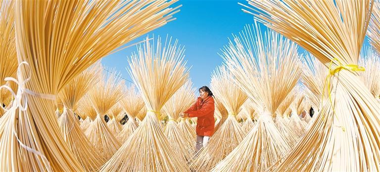 ◀12月18日,江西省赣州市宁都县湛田乡湛田村竹制品加工厂,工人在晾晒竹丝。