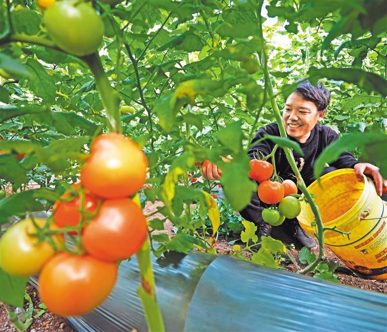 ▼12月11日,山东省临沂市郯城县郯城街道新屯村蔬菜大棚内生机盎然,农民忙着采摘西红柿供应市场。