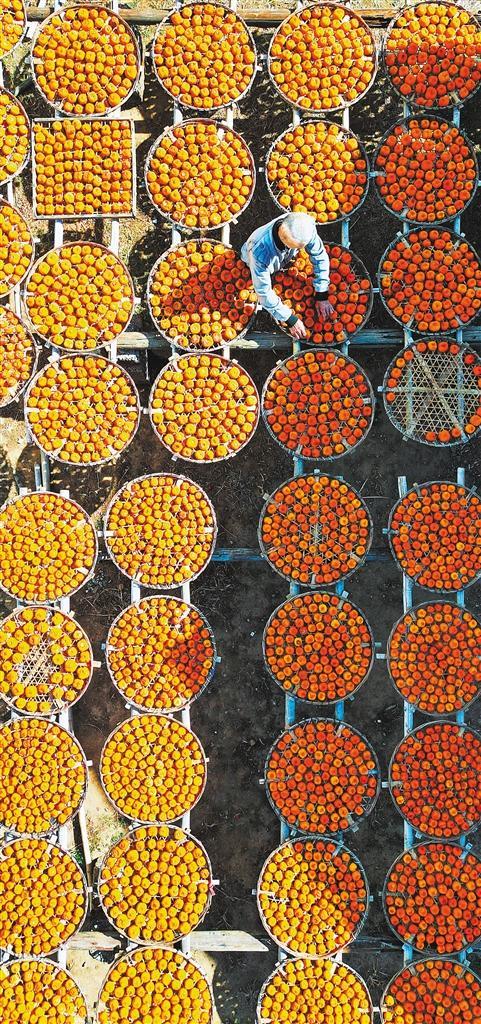 ▼12月15日,广西壮族自治区恭城瑶族自治县嘉会镇泗安村,村民在加工柿饼。