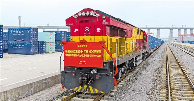 十二月二十六日,湖南省怀化国际陆港主港区,怀化国际陆港今年第一千列班列暨泰格林纸专列成功发车。此次发车货物经怀化、柳州至北部湾(钦州港)出海,然后海运至沙特阿拉伯达曼港。田 敏摄(中经视觉)