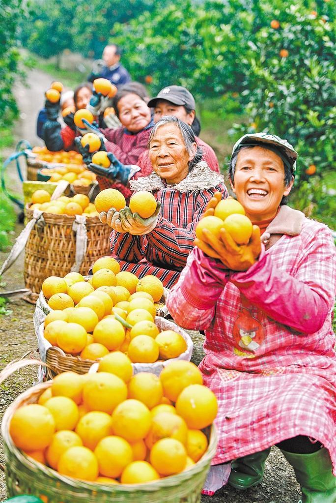 ▼12月25日,四川广安邻水县复盛镇,果农在展示采摘的脐橙。邱海鹰摄(中经视觉)