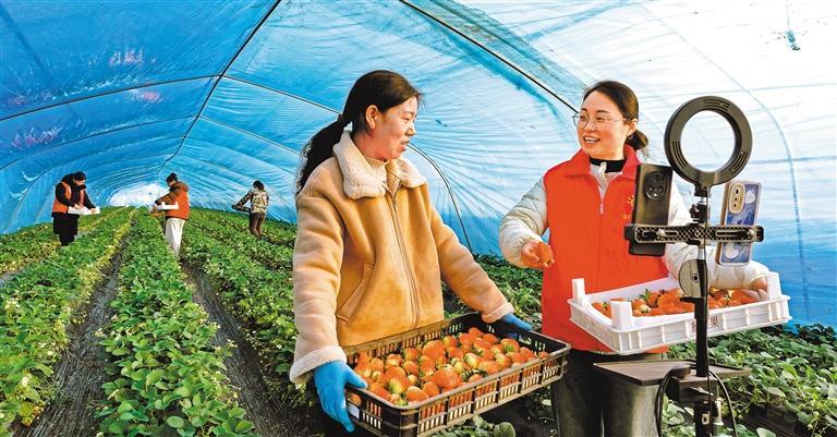 ◀十二月二十四日,江苏泗洪县车门乡王沟村草莓种植基地,党员志愿者在直播销售草莓。
