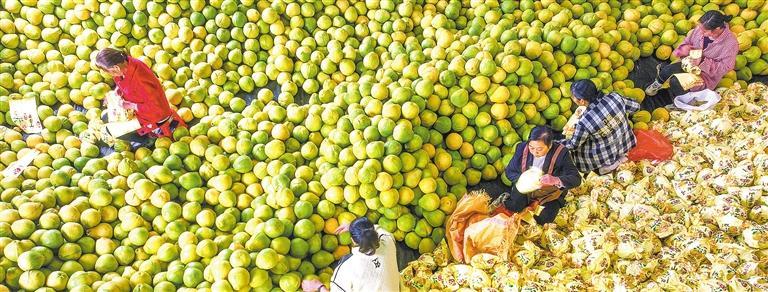 ◀11月23日,湖南永州云雾山香柚专业合作社,工人在分拣包装柚子。