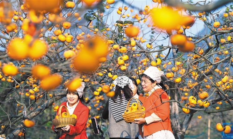 ▼12月14日,广西桂林恭城瑶族自治县莲花镇红岩村,游客在柿子园采摘。