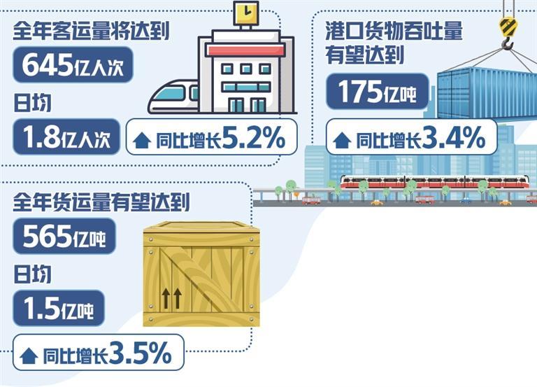 全年客运量将达到645亿人次,日均1.8亿人次,同比增长5.2%;货运量有望达到565亿吨,日均1.5亿吨,同比增长3.5%;港口货物吞吐量有望达到175亿吨,同比增长3.4%……国新办27日举行的“中国经济高质量发展成效”系列新闻发布会上发布的数据显示,2024年我国交通运输行业顺利完成各项年度目标任务,交通运输服务质效不断提高。