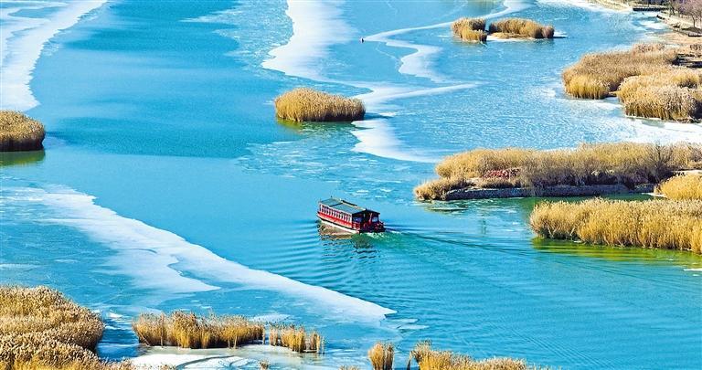 12月27日,宁夏回族自治区石嘴山市平罗县沙湖旅游景区,游客乘船观赏美景,体验破冰之美。寒冬时节,景区利用冬季旅游资源,打造优质旅游项目,吸引游客前来观赏。袁宏彦摄(中经视觉)