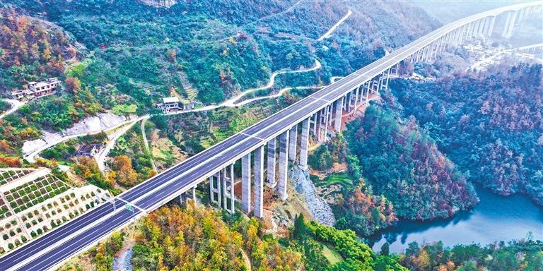 图为渝湘复线高速彭水至酉阳段鱼梁溪特大桥远景。目前,渝湘复线高速公路重庆巴南至武隆段、彭水至酉阳段已具备通车条件,即将投入运行。届时,从重庆中心城区前往酉阳,较既有渝湘高速车程缩短约60分钟。