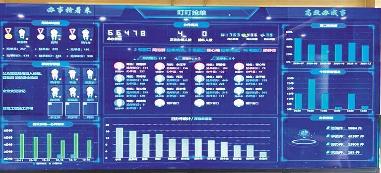 “叮叮抢单”:推动综窗服务大变革。2023年6月,“叮叮抢单”系统1.0版在红谷滩区政务服务大厅惊艳亮相。通过建立窗口人员绩效评估机制,以企业群众办事等待时间、服务质效等关键指标为依据,形成了正向激励与反向约束机制,激发了窗口人员的工作热情和积极性。2024年6月,2.0版系统重磅升级,带来了更多惊喜。在取号机上设置“明星取号”,企业、群众可按需选择“专家号”或“普通号”,如同在政务服务大厅开启了一场个性化的服务之旅。同时,系统对业务数据进行深入分析,实现了窗口资源的科学调配,让企业、群众平均等待时长压缩至2分钟、办件时长平均压缩至10分钟。