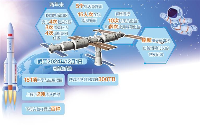 《报告》显示,两年来,我国先后组织完成4次载人飞行、3次货运补给、4次飞船返回任务,5个航天员乘组、15人次在轨长期驻留,累计进行10次航天员出舱和多次应用载荷出舱,开展多次舱外维修任务,刷新航天员单次出舱活动时长的世界纪录,完成包括2名港澳载荷专家的第四批预备航天员选拔、低成本货物运输系统择优并启动研制等工作。目前,中国空间站在轨运行稳定、效益发挥良好。