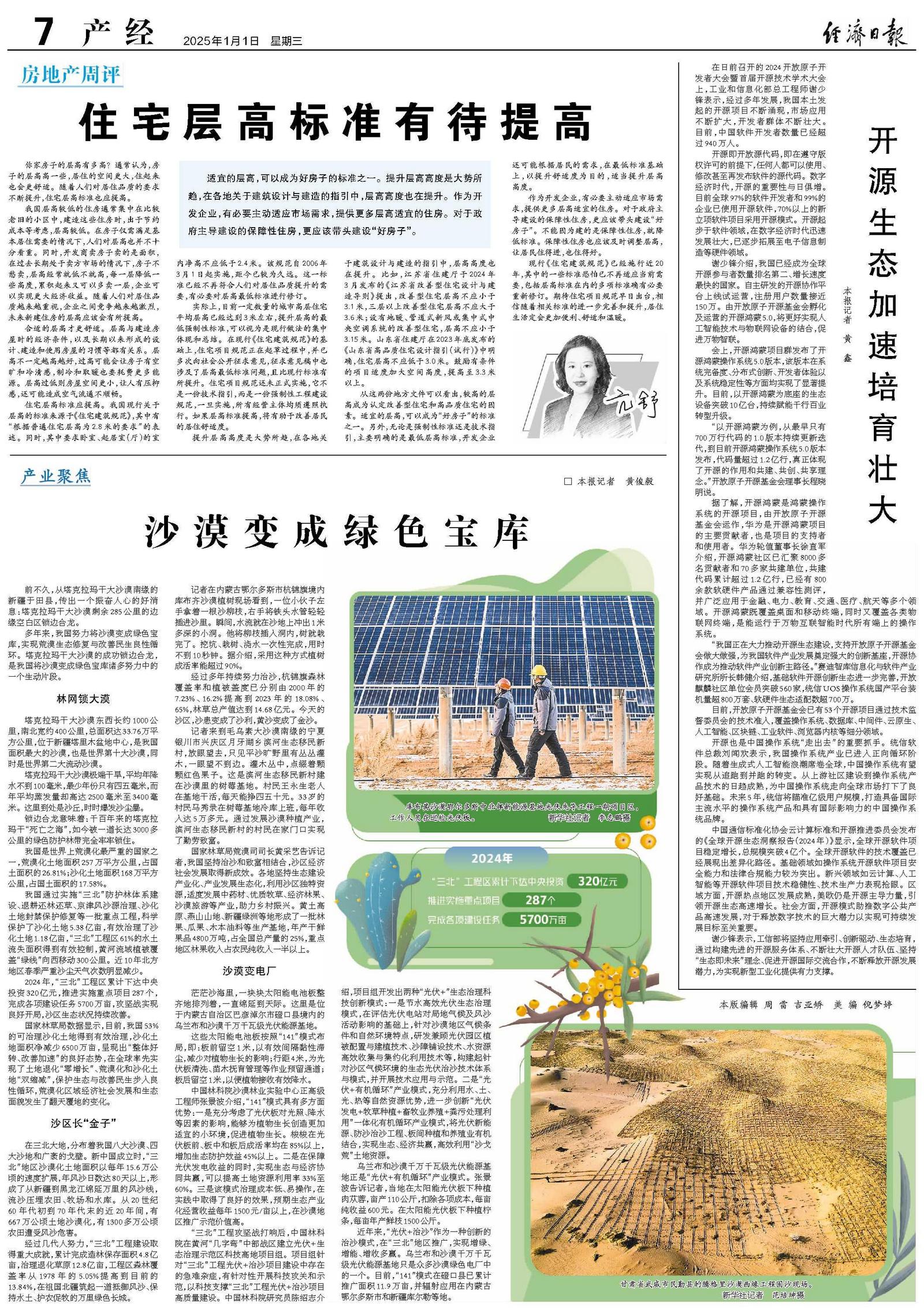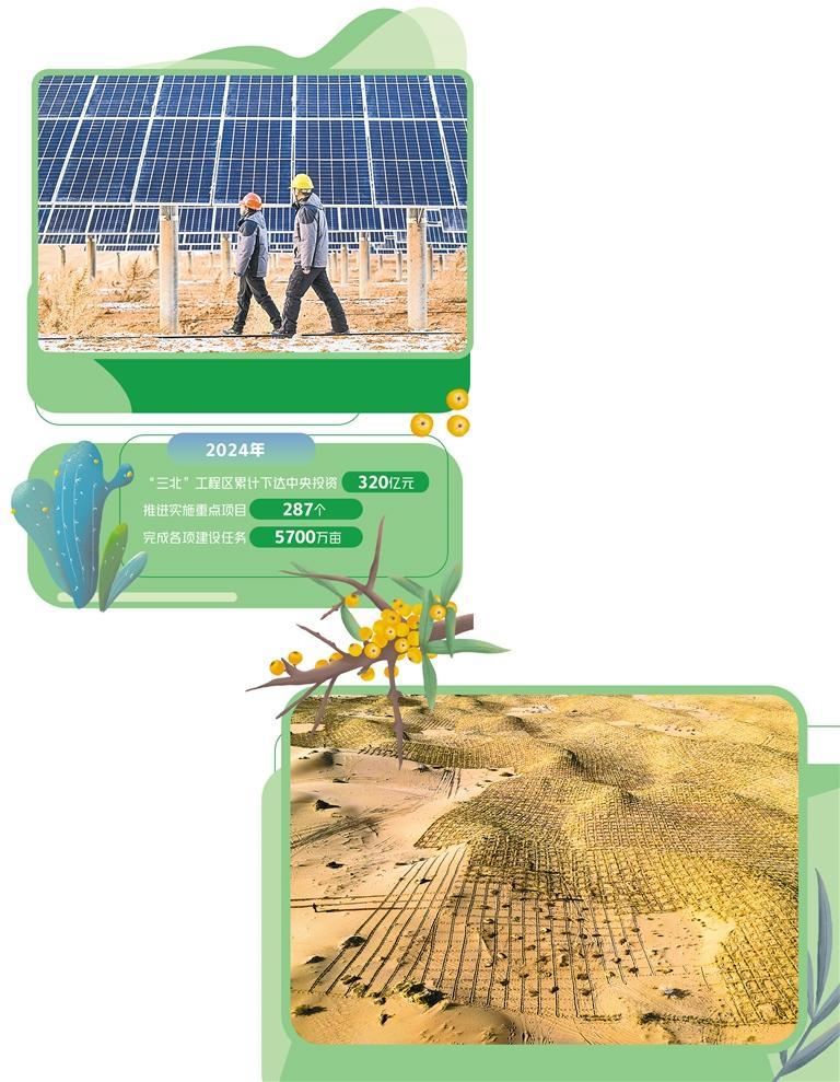 2024年,“三北”工程区累计下达中央投资320亿元,推进实施重点项目287个,完成各项建设任务5700万亩,攻坚战实现良好开局,沙区生态状况持续改善。
