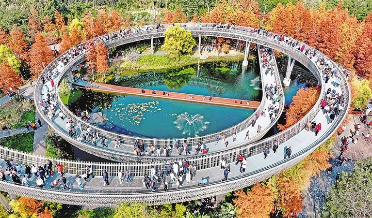1月1日,福建省福州市福道梅峰山地公园内,多彩水杉引来众多市民欣赏美景、享受假日。王旺旺摄(中经视觉)