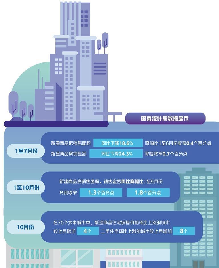 随着一系列政策“组合拳”落地见效,2024年10月份,房地产市场出现了诸多积极变化。一是10月份个人住房贷款规模企稳,明显好于2024年前9个月的月均减少690亿元水平,也好于前两年同期水平。二是市场交易提速,1月份至10月份,新建商品房销售面积、销售金额同比降幅比1月份至9月份分别收窄1.3个百分点、1.8个百分点。三是房价回稳迹象初步显现,10月份,在70个大中城市中,新建商品住宅销售价格环比上涨的城市较上月增加4个,二手住宅环比上涨的城市较上月增加8个。