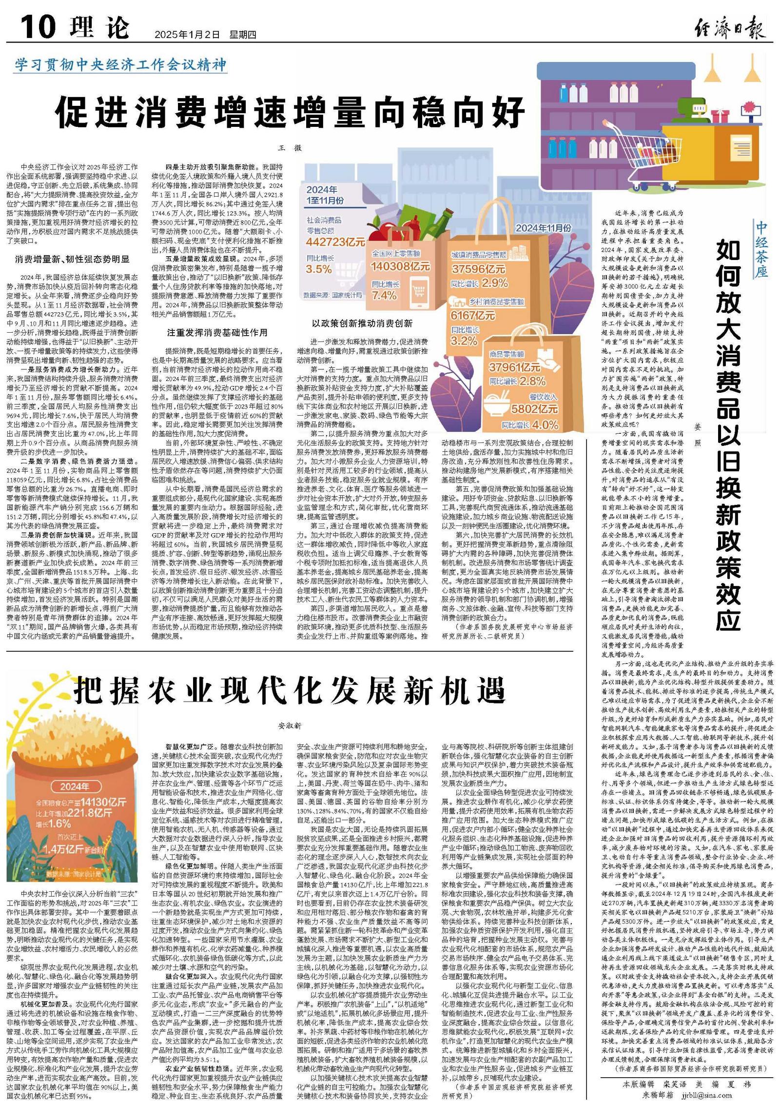 一段时间以来,“以旧换新”的政策效应持续显现。商务部数据显示,截至2024年12月19日24时,全国汽车报废更新近270万辆,汽车置换更新超310万辆,超3330万名消费者购买相关家电以旧换新产品超5210万台,家装厨卫“焕新”补贴产品超5300万件。进一步放大“以旧换新”的政策效应,需更好把握居民消费升级机遇,坚持政府引导、市场主导,努力调动各类主体积极性。一是充分发挥经营主体作用。引导生产企业加强消费品研发设计、推动产品性能的迭代升级,鼓励流通企业利用线上线下渠道设立“以旧换新”销售专区,同时支持再生资源回收领域龙头企业发展。二是落实财税支持政策。以财政资金支持撬动社会资本投入,支持企业开展促销优惠活动,更大力度推动消费品置换更新。可以考虑落实“反向开票”等惠企政策,让企业得到“真金白银”的支持。三是发挥金融支持作用。鼓励金融机构在依法合规、风险可控的前提下,聚焦“以旧换新”领域开发广覆盖、差异化的消费信贷、保险等产品,合理确定消费信贷产品的首付比例、贷款利率和还款期限,完善保险产品的定价和理赔管理。四是营造良好环境。加快完善重点消费品领域的标准认证体系,鼓励各方采信认证结果。引导行业加强自律性监管,完善消费者投诉办理反馈制度,合理保障消费者权益。