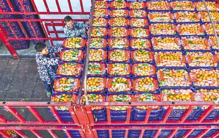 1月2日,江西省抚州市南丰县天天来果业公司工人将蜜桔装车,销往全国各地。近年来,南丰县依托资源优势,大力发展精品蜜桔种植,带动柑橘类蜜饯、果酱、果汁等精深加工产业发展,拓宽村集体经济增收渠道,增加用工岗位,帮助村民在家门口就业增收。谢 东摄(中经视觉)