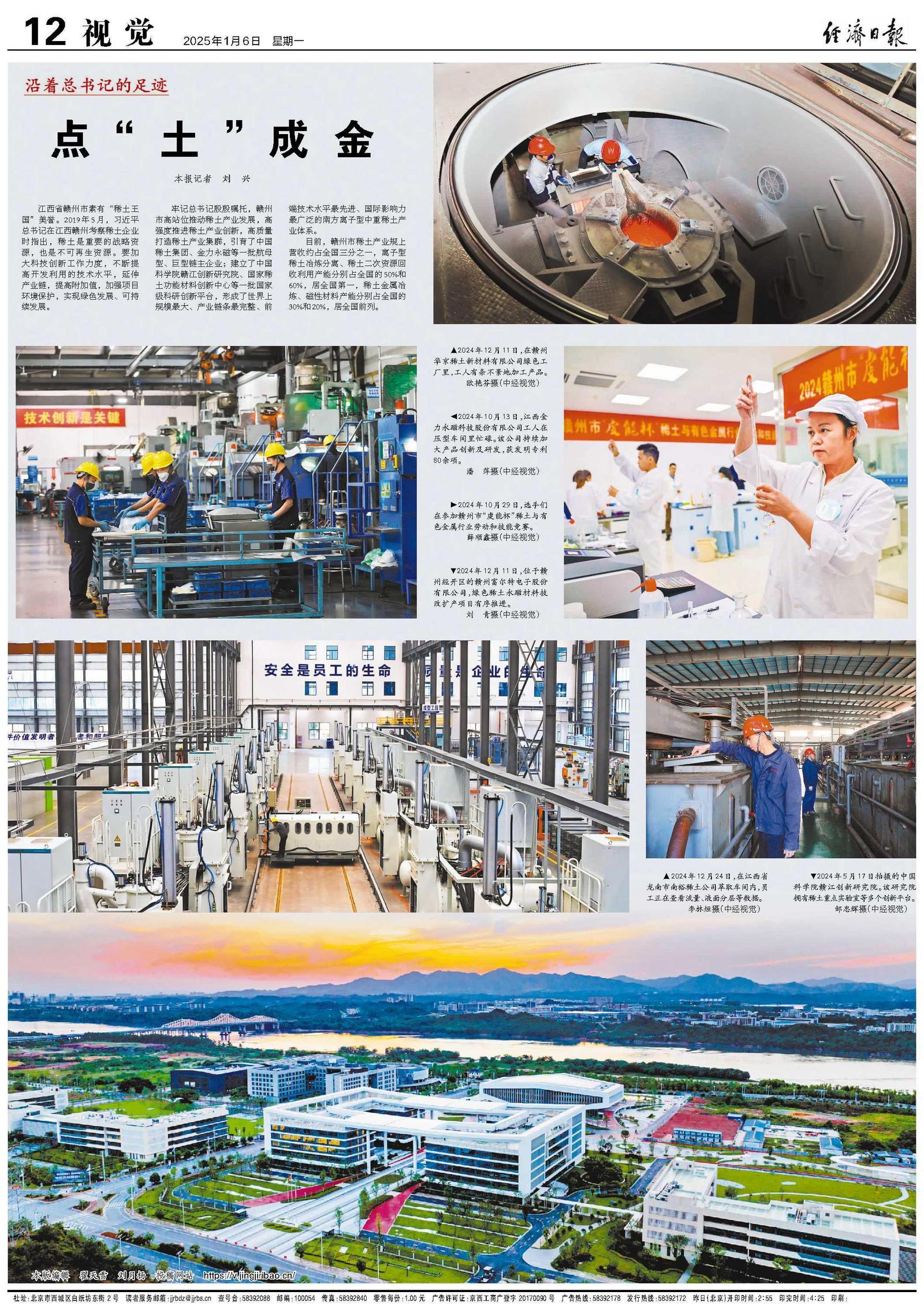 牢记总书记殷殷嘱托,赣州市高站位推动稀土产业发展,高强度推进稀土产业创新,高质量打造稀土产业集群,引育了中国稀土集团、金力永磁等一批航母型、巨型链主企业;建立了中国科学院赣江创新研究院、国家稀土功能材料创新中心等一批国家级科研创新平台,形成了世界上规模最大、产业链条最完整、前端技术水平最先进、国际影响力最广泛的南方离子型中重稀土产业体系。