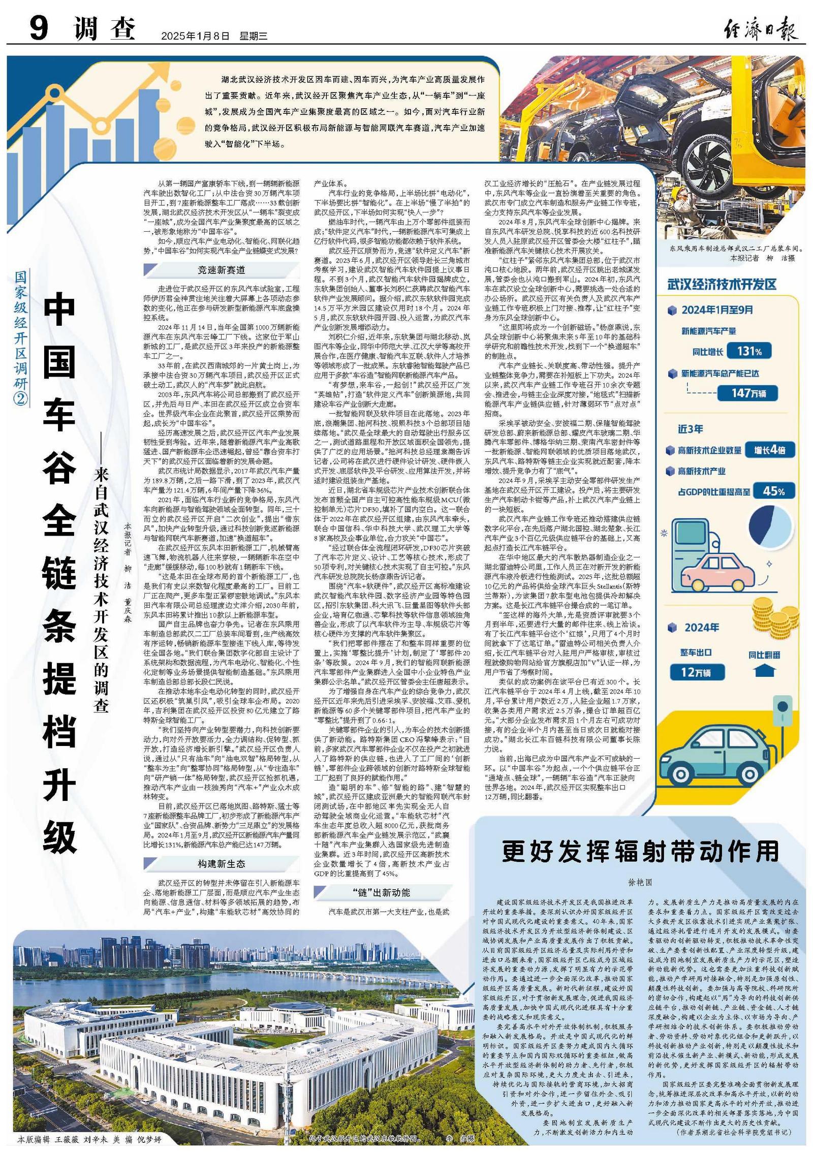 当前,出海已成为中国汽车产业不可或缺的一环。以“中国车谷”为起点,一个个供应链平台正“通堵点、链全球”,一辆辆“车谷造”汽车正驶向世界各地。2024年,武汉经开区实现整车出口12万辆,同比翻番。