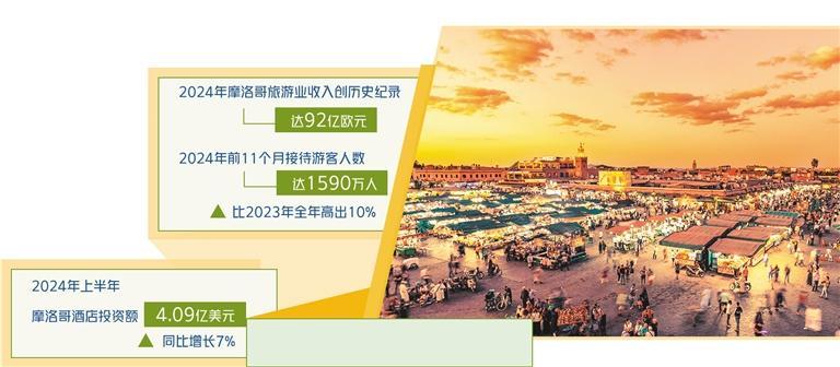 旅游业是摩洛哥经济支柱产业之一。根据摩洛哥国家旅游局2024年12月底公布的数据,2024年摩洛哥旅游业收入创历史纪录,已达92亿欧元。摩洛哥当年接待的游客人数同样突破历史纪录,统计数字显示,摩洛哥在2024年前11个月接待的游客人数达到1590万人,比2023年全年高出10%。