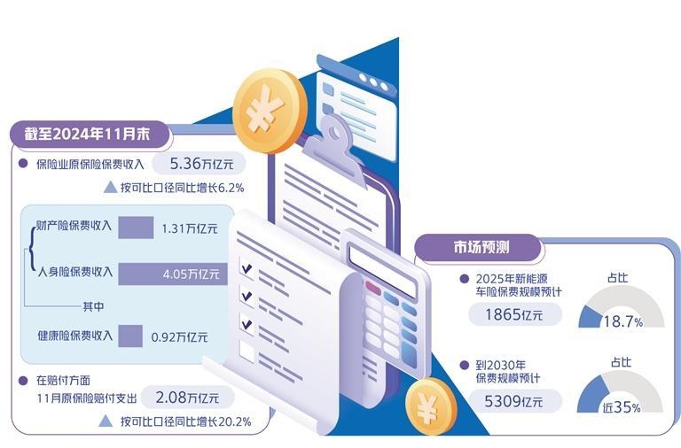 新能源汽车销量在2024年也迅猛增长,部分月份销量占全国乘用车市场的一半,新能源车险成为车险行业的第二增长曲线。市场预测,2025年新能源汽车销量将达1167万辆,车险保费规模预计达1865亿元,占比18.7%;到2030年,保费规模预计达5309亿元,占比近35%。
