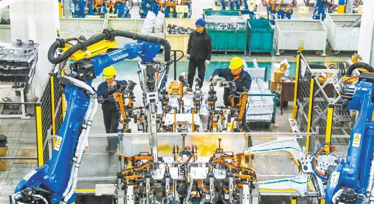 ▼1月3日,江苏扬州市洪泉实业有限公司,智能机器人在生产线上作业。