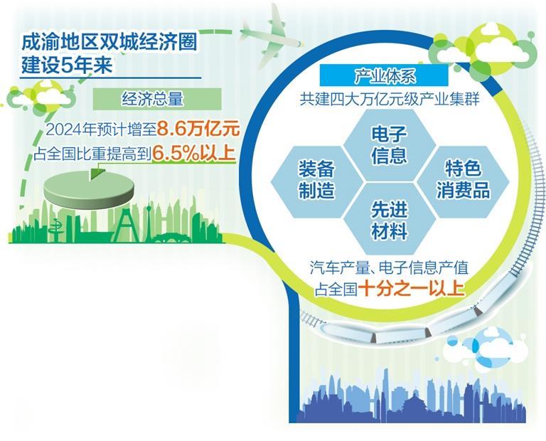 一是具有全国影响力的重要经济中心建设实现新跃升。经济总量上,双城经济圈地区生产总值5年迈上了两个万亿元级台阶,2024年预计增至8.6万亿元,占全国的比重由6.3%提高到6.5%以上;产业体系上,两地共建电子信息、装备制造、先进材料、特色消费品四大万亿元级的产业集群,汽车产量、电子信息产值占全国十分之一以上。