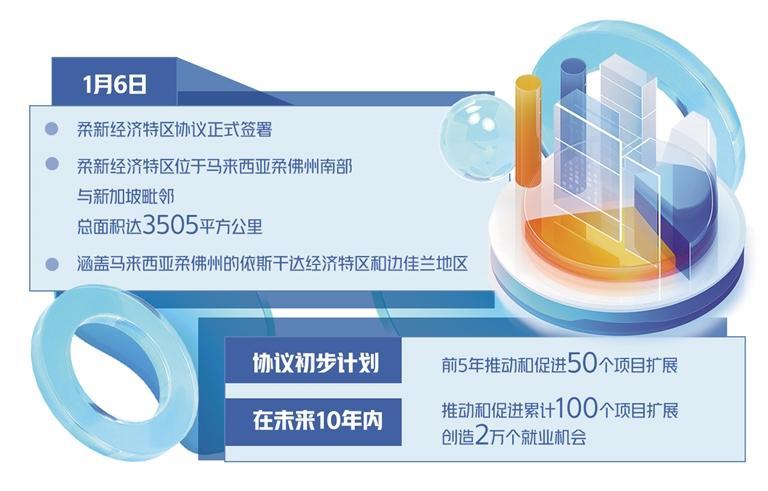 柔新经济特区协议鼓励来自第三国和新加坡的企业拓展至此,投资领域包括制造业、物流、旅游、能源、金融服务、商业服务、教育及医疗保健等11个方面。协议初步计划,前5年推动和促进50个项目扩展。在未来10年内,推动和促进累计100个项目扩展,并创造2万个就业机会。