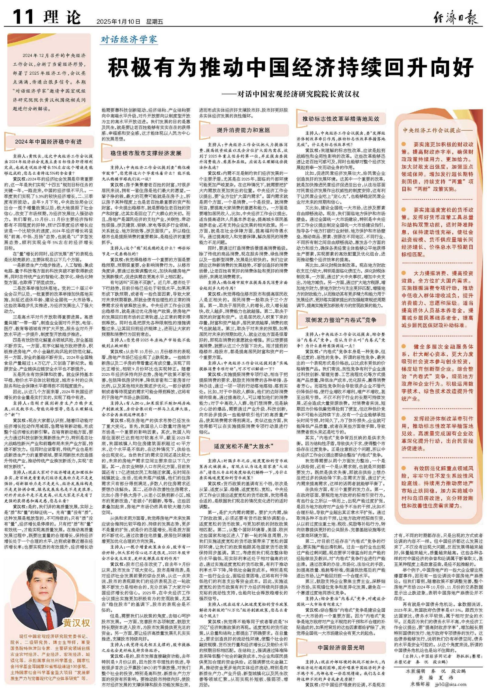 黄汉权:内需不足是制约我们经济发展的一个主要矛盾,尤其是在2025年,面临的外部环境可能更加严峻复杂。在这种情况下,就需要把扩大内需放在更加突出的位置。中央经济工作会议提出,要“全方位扩大国内需求”。国内需求就是两个方面,一个是消费,一个是投资。就消费而言,要提高大家消费的意愿和能力。一方面是要增加居民收入,比如,中央经济工作会议提出,适当提高退休人员基本养老金,提高城乡居民基础养老金,还有支持企业发展的相关政策。另一方面,就是在社会保障方面,提高福利待遇水平。通过提高收入和完善保障,解决居民的消费能力不足问题。