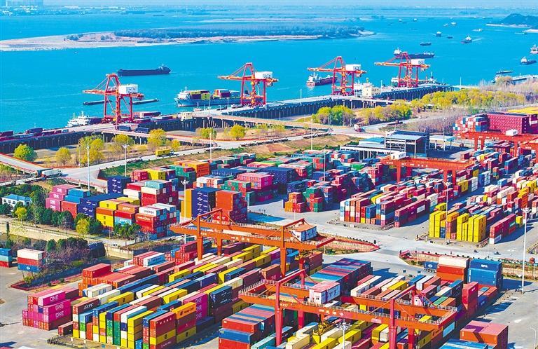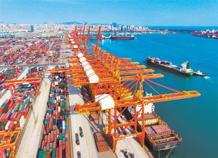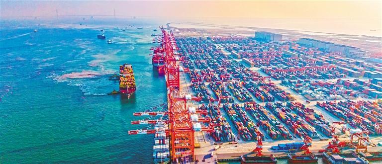 ◀1月8日,山东港口日照港全自动化集装箱码头一派繁忙。