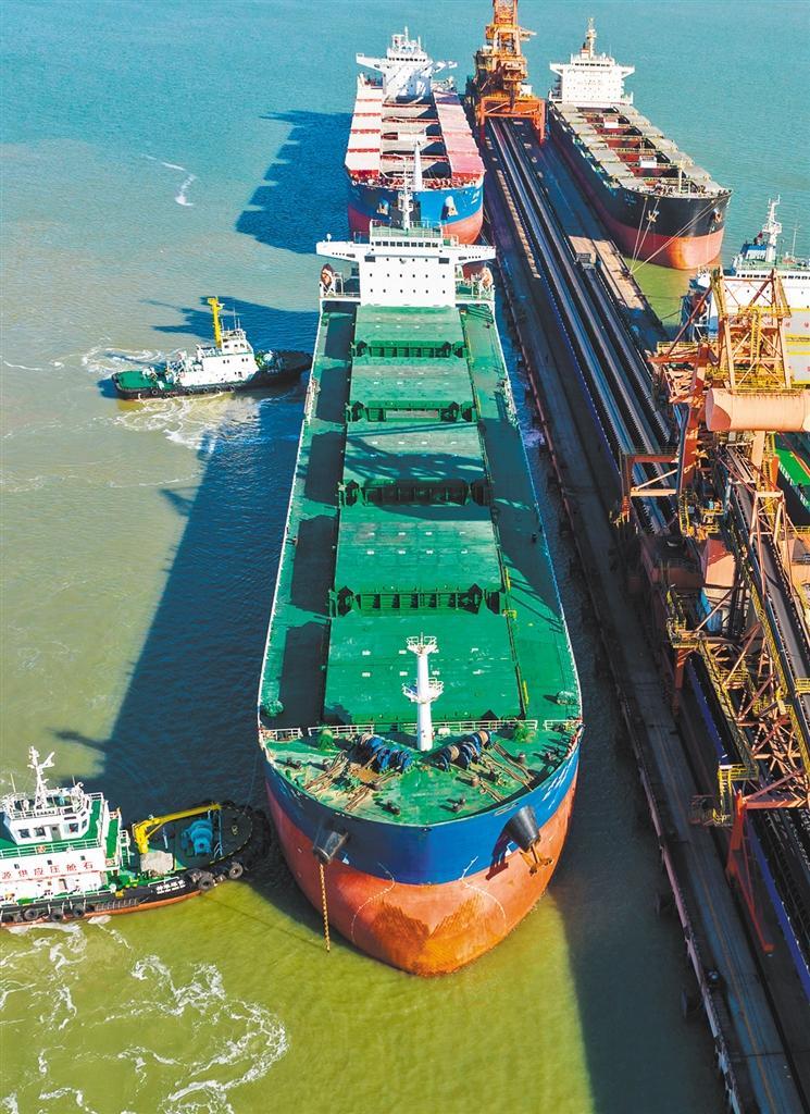 ▲1月8日,江苏连云港新苏港码头,货轮停靠泊位准备卸货。