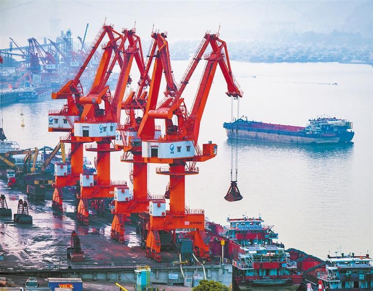 ▲1月8日,安徽芜湖港朱家桥港区国际集装箱码头,船舶在有序装卸集装箱。
