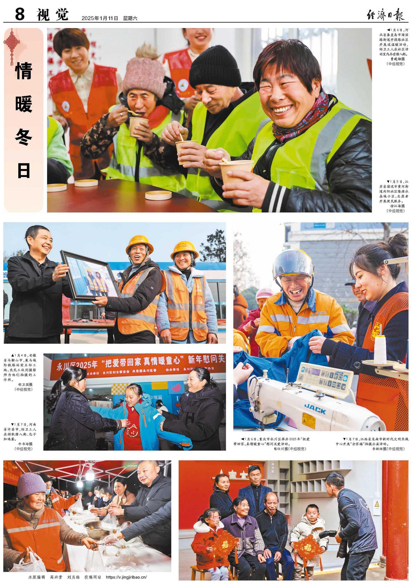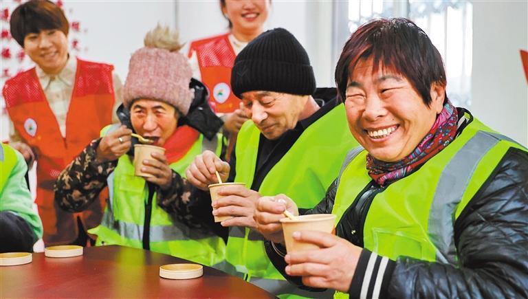 ◀1月6日,河北省秦皇岛市海滨路街道开滦路社区开展送温暖活动,环卫工人在社区活动室内品尝腊八粥。