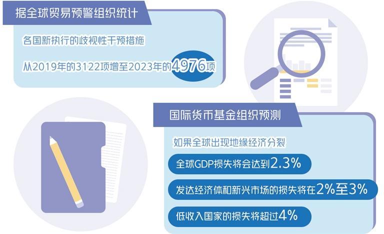 近几年,受疫情、地缘政治冲突等影响,全球物流受阻情况增加,致使各方对全球产业链供应链布局的考量从追求经济效率转向更加重视安全稳定。同时,贸易保护主义和单边主义升温,对全球经济秩序造成严重干扰。据全球贸易预警组织统计,各国新执行的歧视性干预措施从2019年的3122项增至2023年的4976项。有的国家甚至采取过度的保护性措施,对全球产供链合作造成负面影响。国际货币基金组织(IMF)预测,如果全球出现地缘经济分裂,全球国内生产总值(GDP)的损失将会达到2.3%,发达经济体和新兴市场的损失将在2%至3%,低收入国家损失最大,将超过4%。
