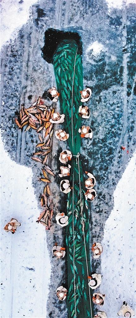 ◀1月11日,新疆巴州博湖县第十七届冬雪季冬捕活动在博斯腾湖大河口景区开幕,渔民正齐心协力拉网捕鱼。