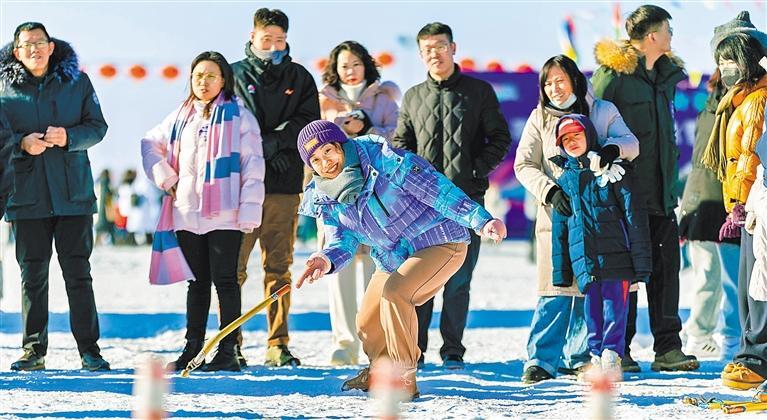 ▼1月10日,游客在内蒙古呼和浩特市赛罕区城市冰雪那达慕上参加民俗活动。