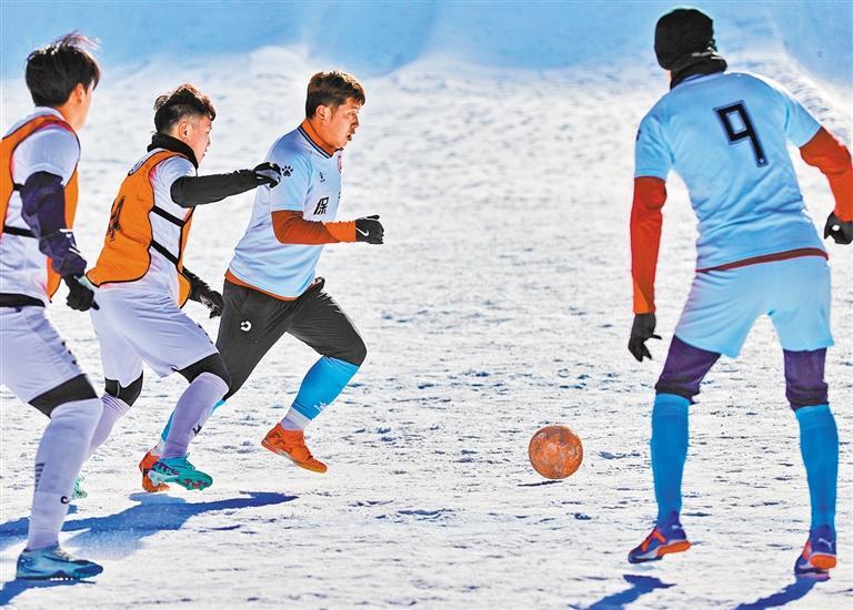 ▼1月8日,河北省第五届冰雪运动会雪地足球比赛在秦皇岛市老君顶景区开展。
