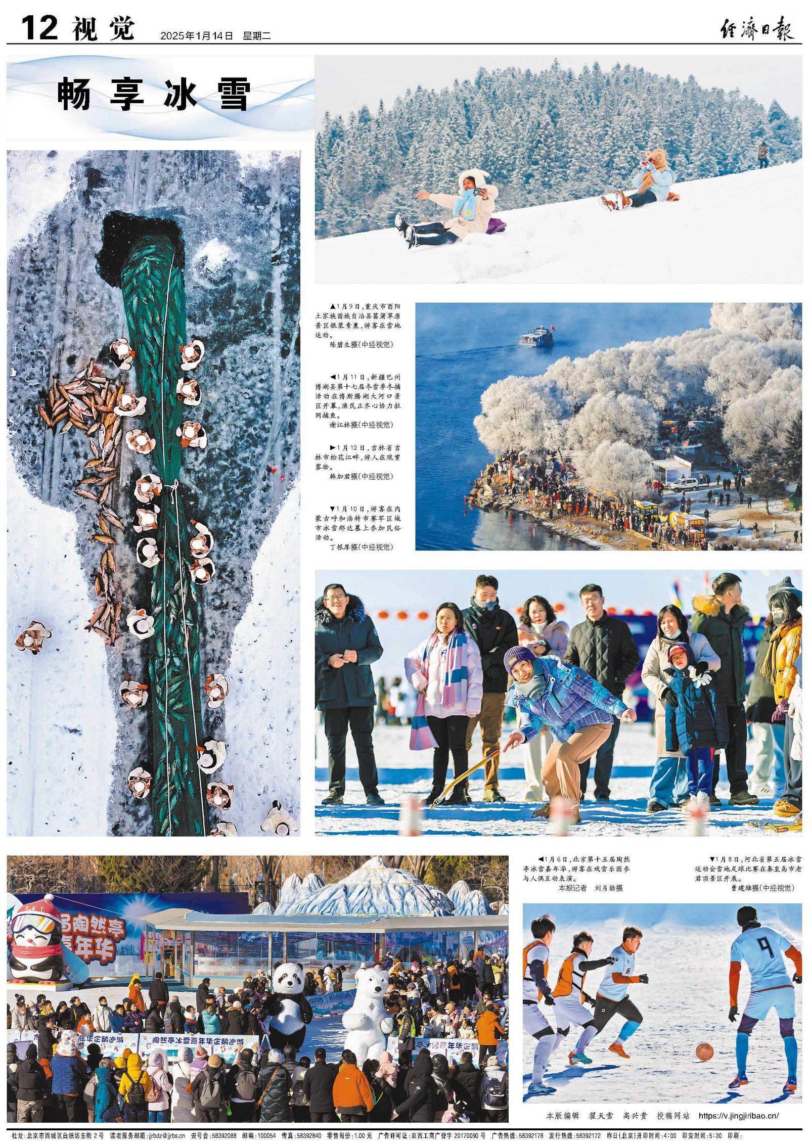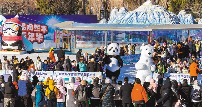 ◀1月6日,北京第十五届陶然亭冰雪嘉年华,游客在戏雪乐园参与人偶互动表演。