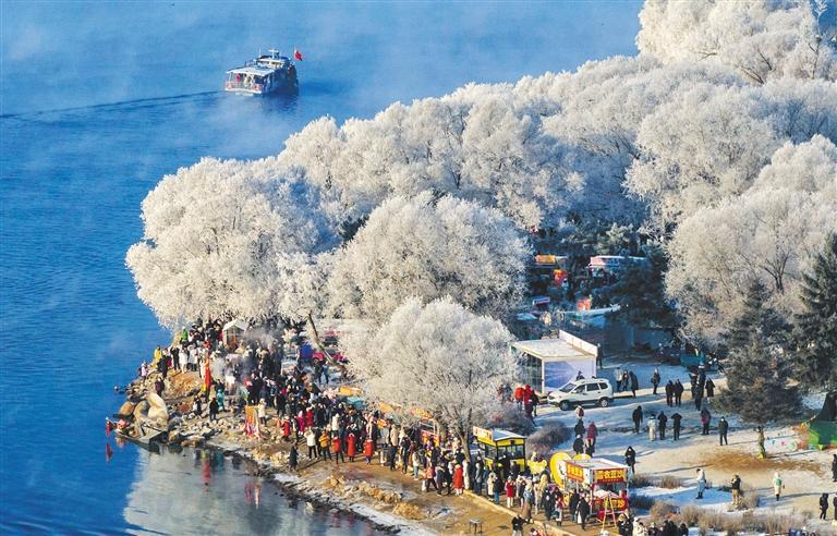 ▶1月12日,吉林省吉林市松花江畔,游人在观赏雾凇。
