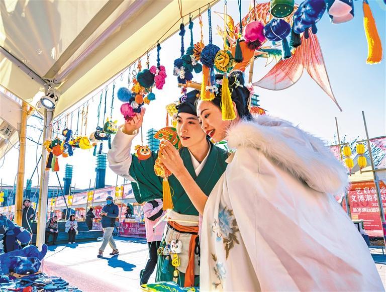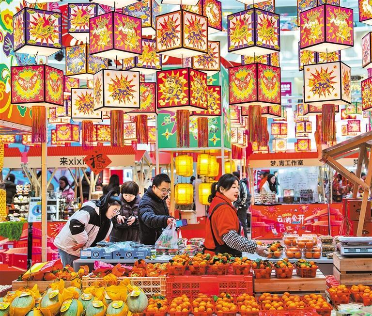 ▼1月10日,江苏苏州工业园区文博商业广场新年市集,50余家年味、年俗、年礼摊位及童年游戏、非遗体验、书法春联等互动活动引来市民游客参观选购。