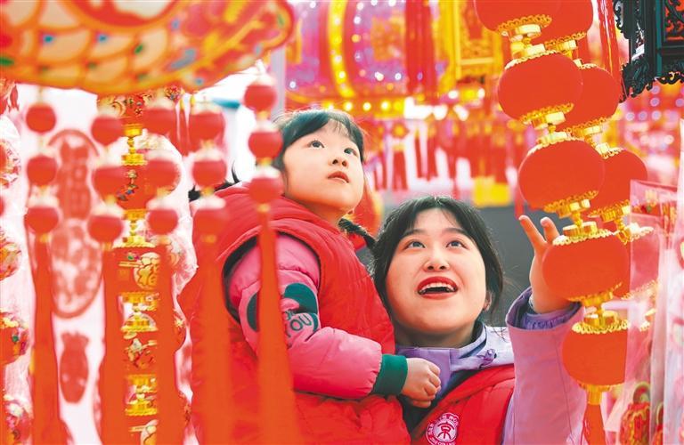 ◀1月14日,市民在山东高密市年货大集上选购新春饰品。