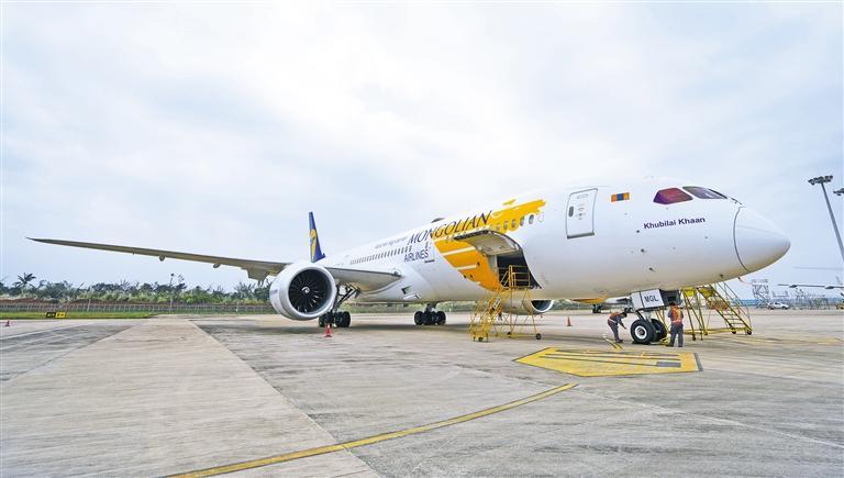 1月16日,一架蒙古航空的波音B787-9飞机来到海南自贸港一站式飞机维修产业基地接受专项维修服务。这是2025年海南自贸港首单进境飞机维修业务。新华社记者 张丽芸摄