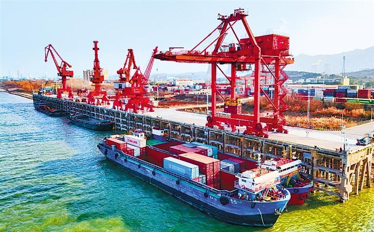 1月15日,两艘货轮在安徽铜陵港长江外贸码头装卸集装箱。2024年,铜陵市共完成港口吞吐量1.04亿吨,同比增长1.19%。储著传摄(中经视觉)