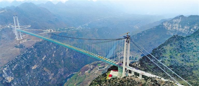 花江峡谷大桥为钢桁梁悬索桥,是六安高速的控制性工程,全长2890米,其中主桥跨径1420米,桥面至水面高度625米。建成后,将成为新的世界第一高桥、世界第一山区跨径桥梁。