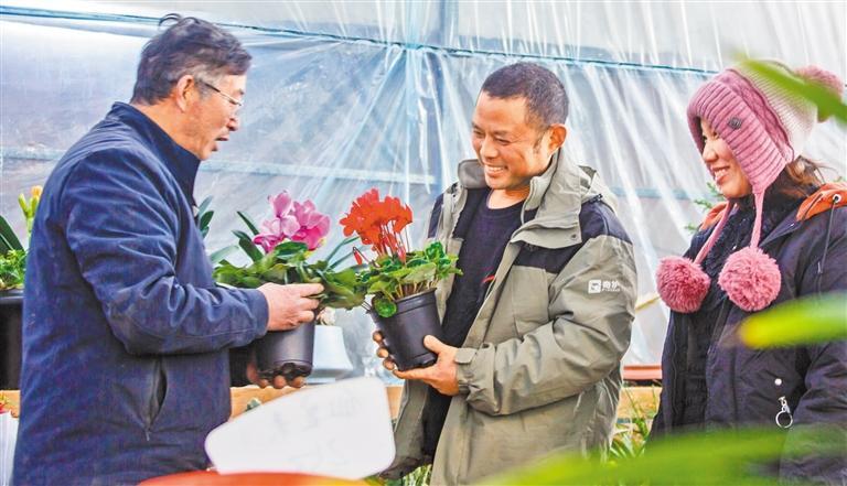 ◀1月15日,江西省吉安市峡江县水边镇现代农业示范园一花卉大棚,市民在挑选年宵花。