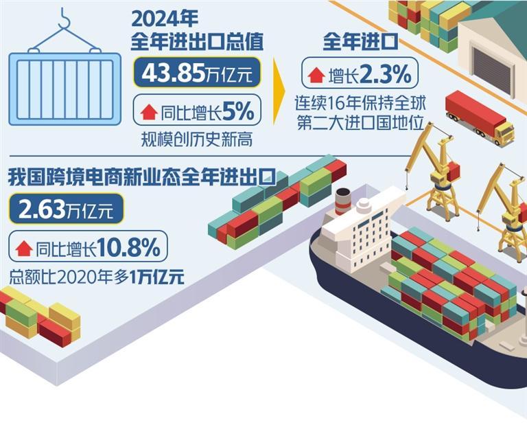 2024年,中国外贸连跨42、43两个万亿级大关,进出口总值达到43.85万亿元,同比增长5%,规模再创历史新高。从增量看,全年外贸增长规模达2.1万亿元,相当于一个中等国家1年的外贸总量。面对复杂严峻的国际环境,中国外贸顶住压力、迎难而上,货物贸易规模再上新台阶、发展质量稳步提升,为全球经贸发展持续贡献力量。